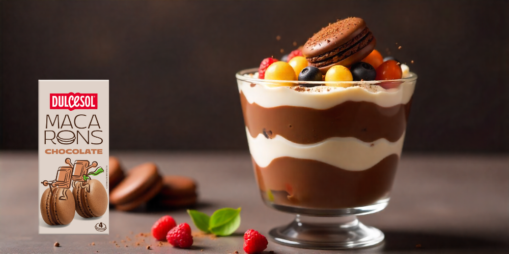 Hoy te traemos una receta irresistible: un trifle de macarons de chocolate Dulcesol, con capas de crema suave, frutas frescas y los inconfundibles macarons de Dulcesol, crujientes por fuera y cremosos por dentro.