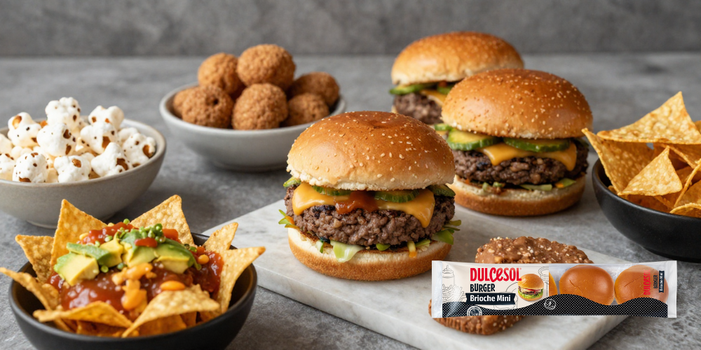 Hoy te contamos los imprescindibles para una sesión de cine perfecta, donde el protagonista indiscutible es el pan de burger mini brioche de Dulcesol, ideal para preparar mini hamburguesas irresistibles.