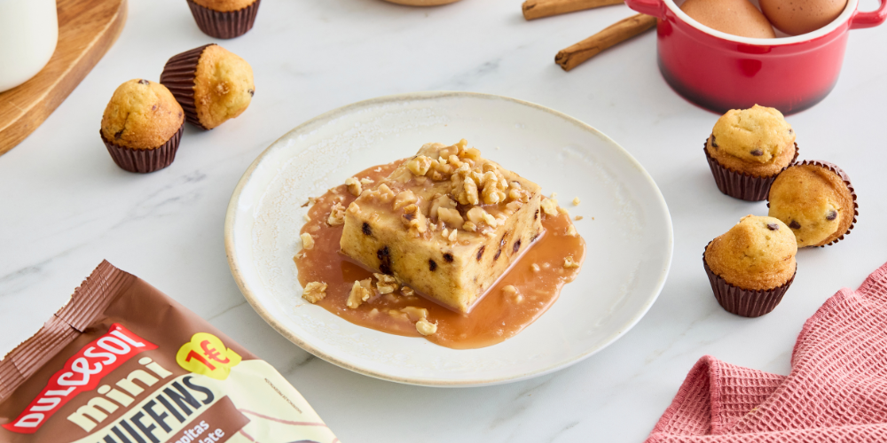 Si te gustan los postres reconfortantes, de esos que huelen a hogar y saben a puro mimo, este pudding caliente de mini muffins Dulcesol con toffee de nuez pecana te va a enamorar.