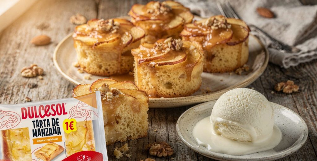 La tarta de manzana es un clásico irresistible, y la Tarta de Manzana Dulcesol. Destaca por su bizcocho suave y esponjoso cubierto con finas láminas de manzana que aportan un toque jugoso y brillante.