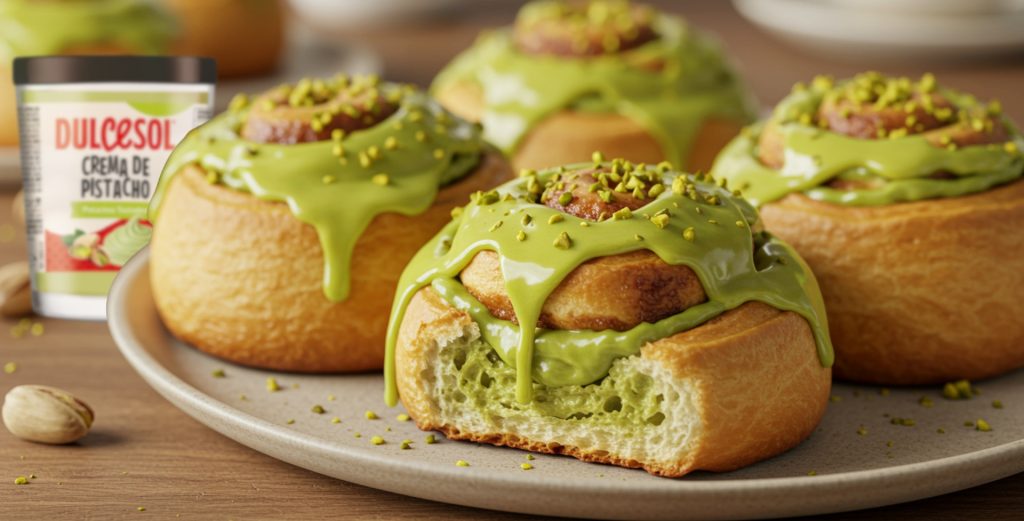 En esta receta, reinterpretamos el clásico cinnamon roll para llevarlo a un terreno más actual con la crema de pistacho Dulcesol.